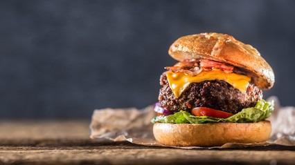 High quality beef medium to well with cheese and sauces on a multigrain bun.